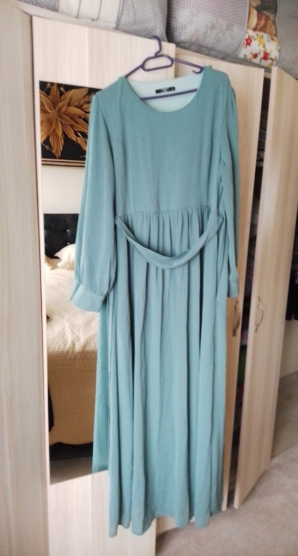 Turkuaz renkli, keten kumaştan uzun, bol kesim ve drapeli elbise. Yuvarlak yaka ve uzun kollu minimalist bohem tarzda, günlük kullanıma uygun klasik şıklık sunar.