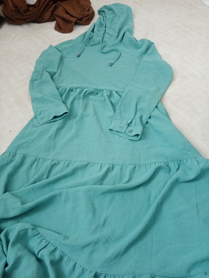 Turkuaz Uzun Keten Elbise Kapüşonlu