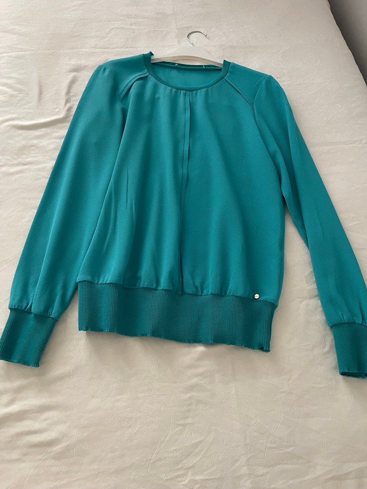 Turkuaz renkli, yuvarlak yakalı ve uzun kollu bu bluz, bol kesimi ve çok güzel kumaşıyla günlük kullanıma uygun, çağdaş ve zahmetsiz şıklık sunar. 42 bedenede olur