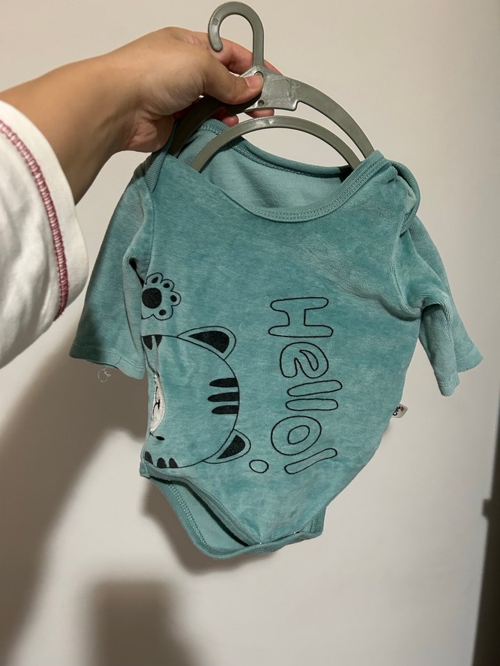 Hiç kullanılmadı yıkanıp ütülenip dolaba kaldırılmıştı. Turkuaz renkli, uzun kollu ve çıtçıtlı bebek body. Yumuşak ve sıcak kumaştan, üzerinde kedi ve "Hello!" baskısı bulunur