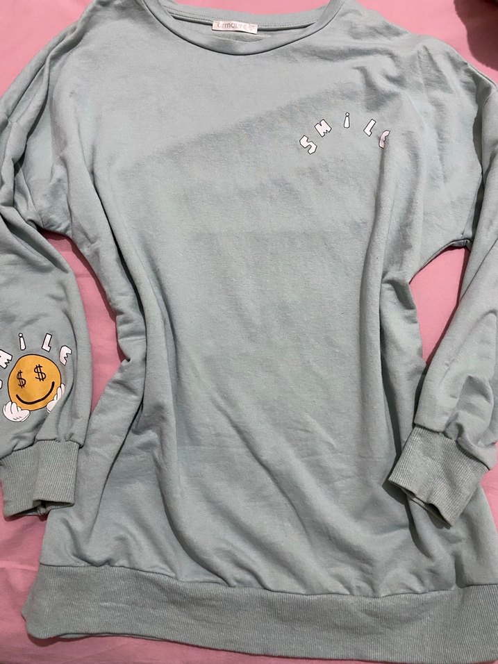 Turkuaz renk, uzun kollu, yuvarlak yakalı, baskılı detaylara sahip bol kesim kadın sweatshirt. Yumuşak ve sıcak kumaş kullanılmıştır.