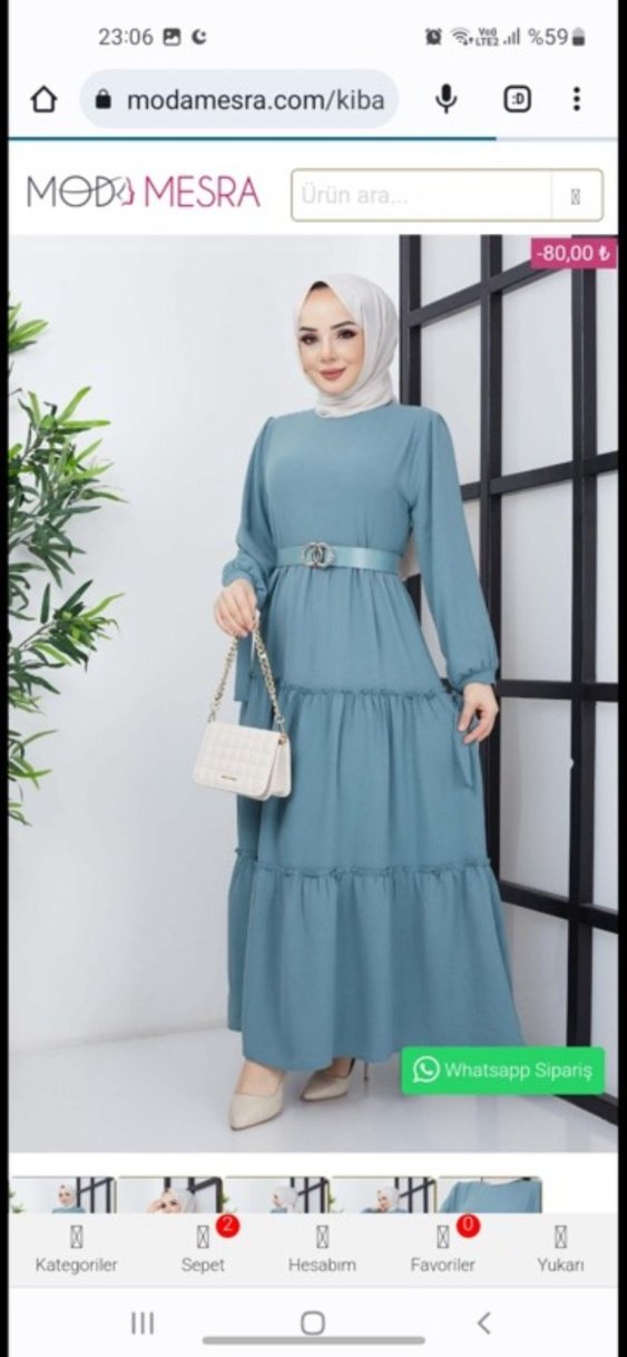 Turkuaz renkte, yüksek yakalı ve kemerli uzun elbise. Sentetik kumaştan, bol kesim ve uzun kolludur. Minimalist, mütevazı ve bohem stil için uygundur.