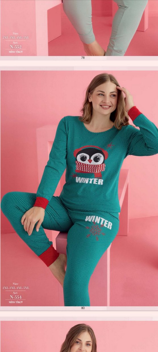 Turkuaz renkli, uzun kollu, bol kesim pijama takımı. Üzerinde baykuş baskısı ve 'WINTER' yazısı bulunur. Kırmızı manşet detaylı, midi boyda rahat kumaş. ❄️