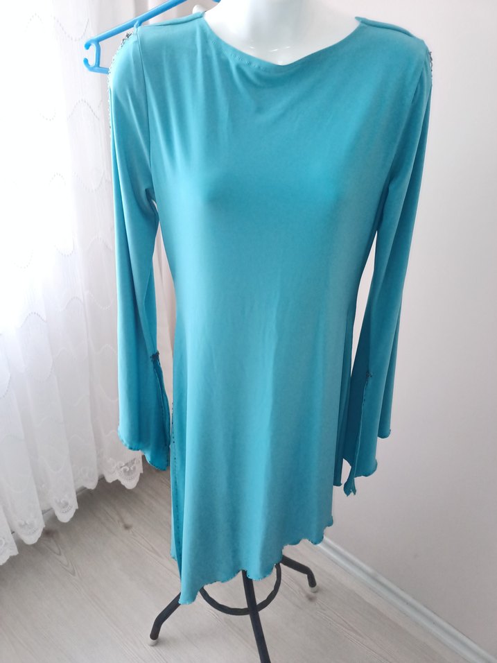 Turkuaz renkte, uzun kollu, yuvarlak yaka ve salaş kesime sahip, dökümlü tasarımlı tunik. Pürüzsüz sentetik kumaştan, minimalist ve çağdaş tarzda, günlük kullanıma uygun.