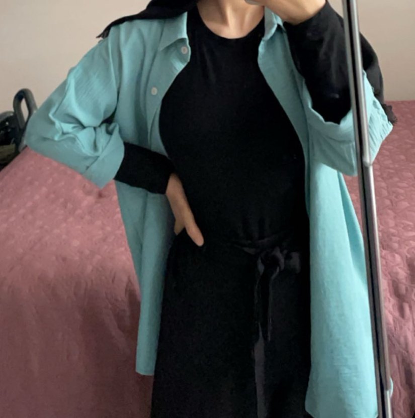 Kadınlar için uzun kollu, bol kesim ve turkuaz renkte sade, desen içermeyen günlük kullanıma uygun gömlek xs-s bedene uygundur 36 bedene uygundur