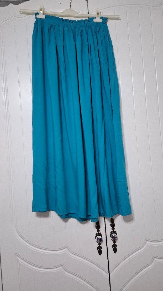 Turkuaz renkli, uzun ve salaş kesimli, drapeli, parlak ve ipeksi dokulu bohem tarzda etek.