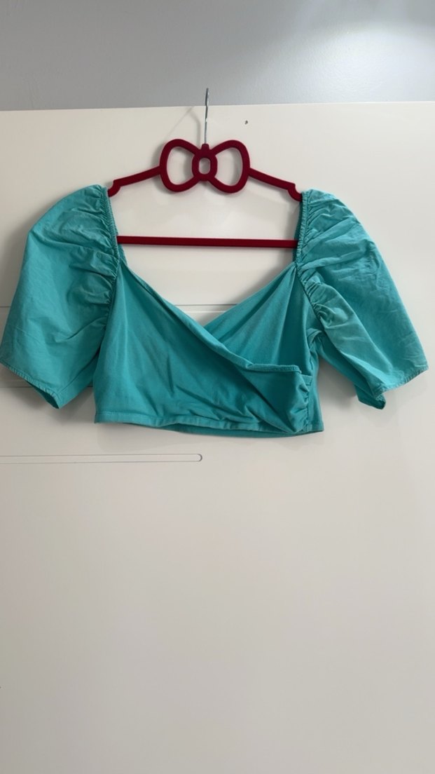 Turkuaz renkte, V yakalı kısa drapeli bluz. Sentetik yumuşak kumaştan, bohem ve minimal sokak tarzına uygun.