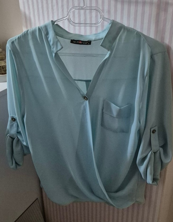 Turkuaz renkli, V yaka ve düğmeli kısa kollu, bol kesim gömlek
