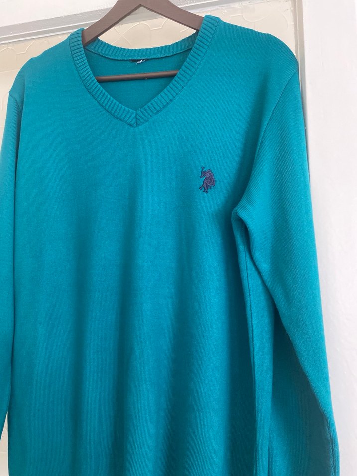 US POLO Turkuaz renkli, V yakalı ve uzun kollu erkek triko kazak. Rahat kesim ve yumuşak, sıcak örme kumaştan, günlük kullanıma uygun.