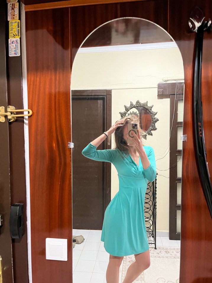 Turkuaz renkli, V yakalı ve uzun kollu, midi boy kadın elbisesi. İpeksi kumaştan üretilmiş, cesur ve bohem tarz için uygundur. Yurt dışından hediye geldi hiç giymedim hiç defosu yok ve kumaşı çok esnek olduğu için herkese uygun olacağını düşünüyorum