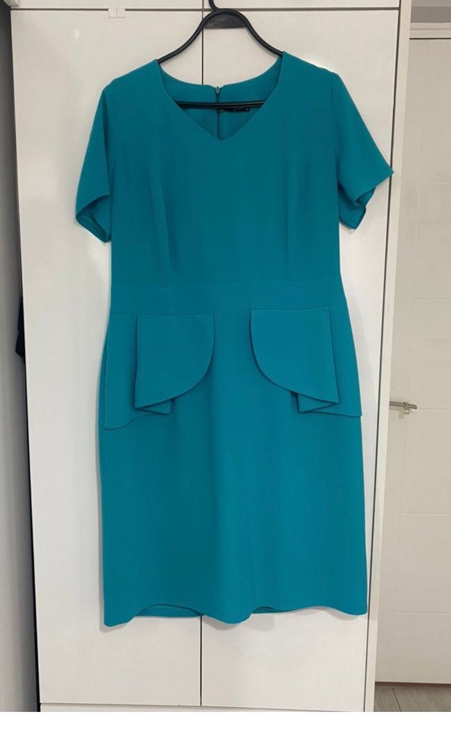 Turkuaz renkte, V yaka ve kısa kollu kalem elbise. Kemer detaylı, midi boyda,fırfır detatlı düz ve şık tasarım. Rahat kesim ve sentetik kumaş. 1 sefer kullanıldı. temiz ve sorunsuz