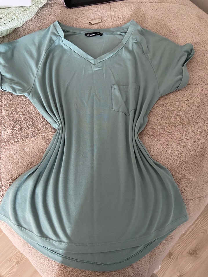 Turkuaz renkli, V yakalı kısa kollu tişört, rahat kesimi ve küçük göğüs cebine sahiptir. Yumuşak keten kumaştan üretilmiş, bohem tarzıyla günlük kullanıma uygundur.