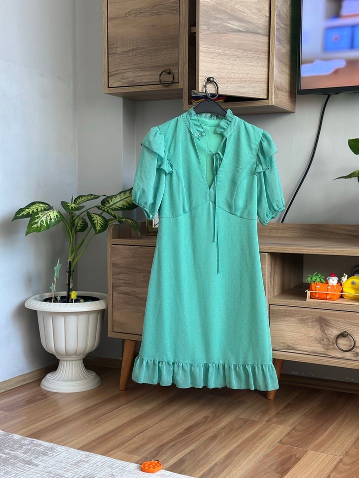Hiç giyilmedi .Yumuşak keten kumaştan, turkuaz pastel renkte, V yakalı, kısa kollu ve fırfır detaylı bol kesim midi elbise. Vintage bohem tarzı için uygundur.