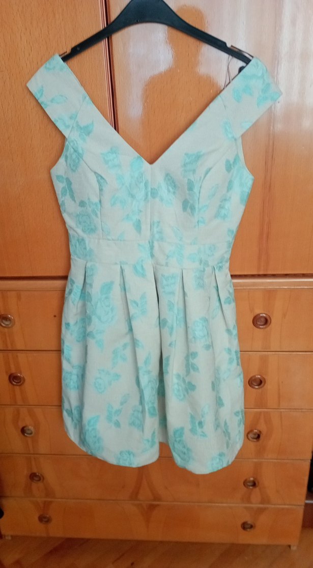 Turkuaz renkli, V yaka ve kalın askılı, arkası gizli fermuarlı midi elbise. Yumuşak sentetik kumaştan üretilmiş, vintage bohem tarzında, düğünler için uygun.