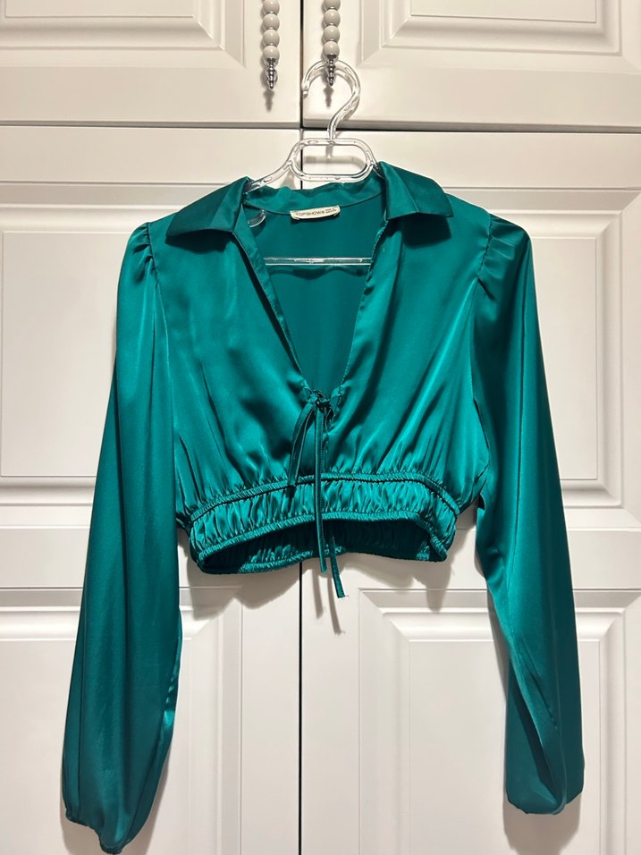 Uzun kollu, V yakalı turkuaz saten bluz, mini kısa ve düğmeli detaylıdır. Romantik akşamlar için uygundur.