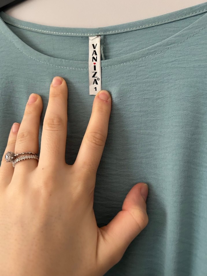 Turkuaz renkli, V yaka, uzun kollu ve yırtmaçlı hamile tişörtü. İnce, ipeksi kumaştan üretilmiştir ve günlük kullanıma uygundur. Hiç giyilmedi