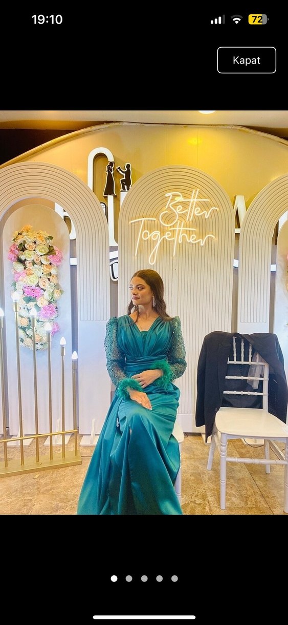 Turkuaz V Yaka Uzun Kollu Kadın Abiye Elbise