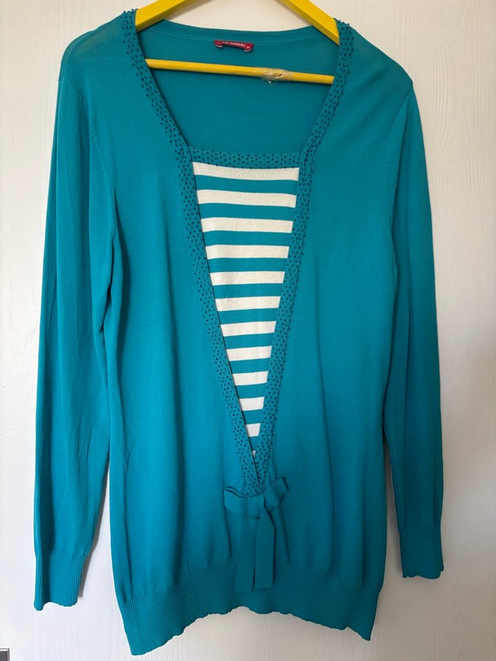 Turkuaz renk, V yaka ve uzun kollu kadın kazak, yumuşak örme kumaştan, bol kesim ve normal boyda. Desensiz, pastel tonlarda, gündelik rahat kullanıma uygun.
