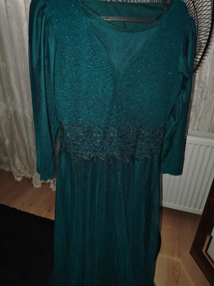 Uzun, bol kesim gece elbisesi, drapeli tasarımı, V yakası ve uzun kolludur. Koyu turkuaz renkte olup vintage tarzındadır, parti için uygundur.