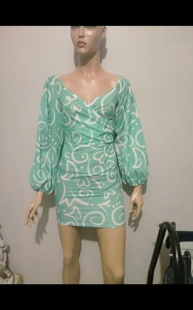 V yakalı, uzun kollu ve drapeli tasarıma sahip, vücuda oturan mini elbise. Yumuşak sentetik kumaştan üretilmiş, pastel turkuaz batik desenlidir. Parti için uygundur.