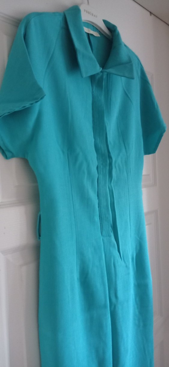 Uzun kesim, kısa kollu elbise. V yakalı, nefes alan kumaştan, turkuaz renkte. Hem ofis, hem günlük kullanımı için uygun.