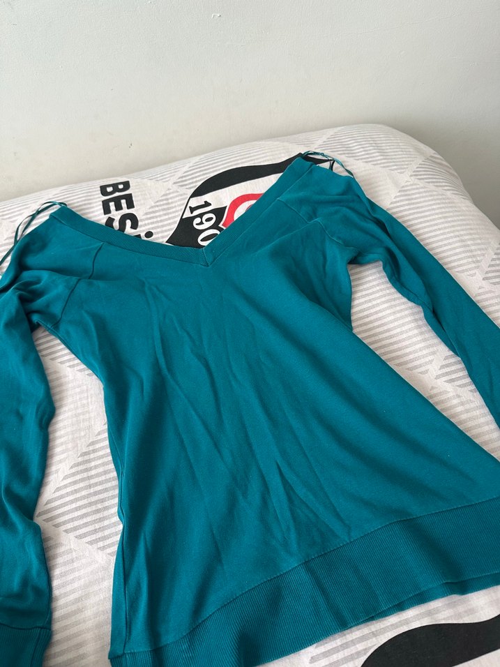 Turkuaz renkli, pamuklu, V yakalı ve uzun kollu hamile tişörtü. Günlük kullanıma uygun, rahat ve şık bir athleisure tarz sunar.