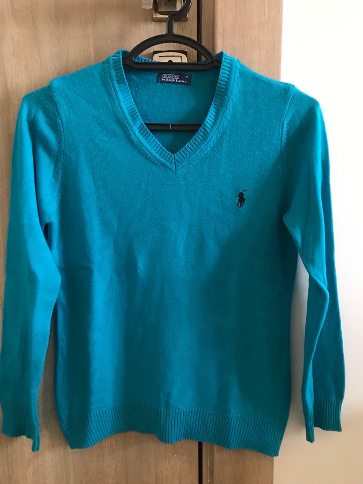 Parlak turkuaz renkte, V yakalı ve uzun kollu dar kesim kadın triko kazak. Bedeni XL