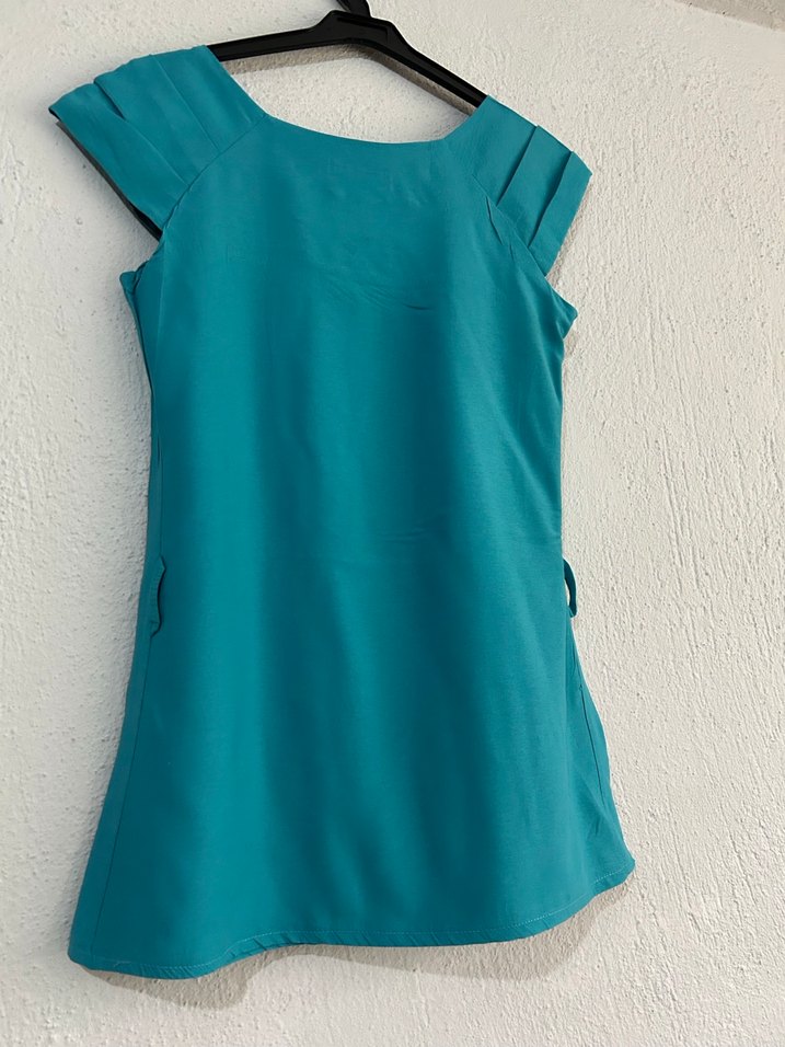 Turkuaz renkli, V yakalı ve kolsuz hamile tunik. Parlak sentetik kumaştan, drapeli ve midi boyda, rahat kesimli, günlük kullanıma uygun.