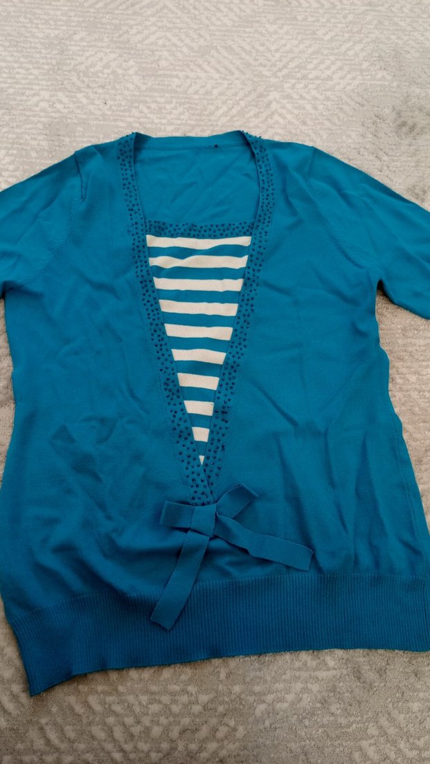 Turkuaz renkli, V yakalı, kısa kollu triko bluz. İnce ve parlak dokusu günlük kullanıma uygundur.