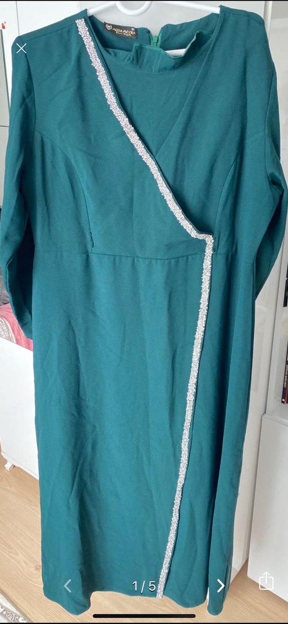 Turkuaz renkli, V yakalı, uzun kollu ve drapeli tasarıma sahip abiye elbise. Parlak dokusu ve sade kesimiyle düğünler için uygundur.