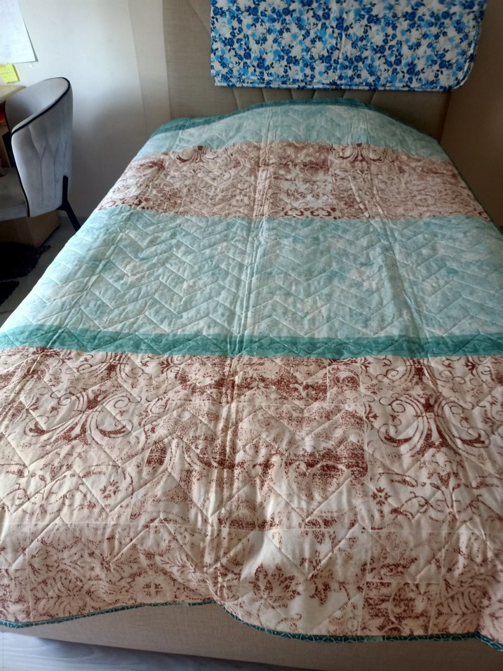 Pastel turkuaz ve bej renklerde, yumuşak dokulu yatak örtüsü. Düz ve hafif kapitone detaylıdır.fiyat adet fiyatlaridir. 6 adet tek kisilik 2 adet cift kisilik mevcuttur ️