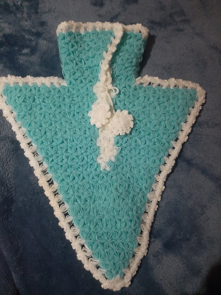 Turkuaz ve beyaz renklerde, dokulu örgü deseni ve süs püskülü olan yumuşak banyo süngeri.