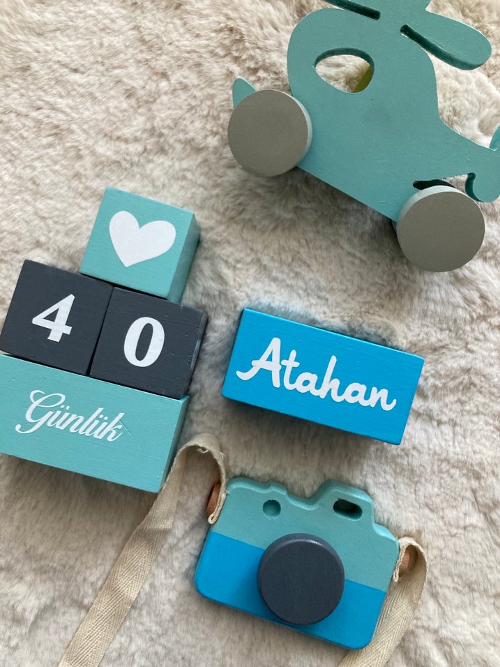 Turkuaz ve gri renkte, kamera, helikopter ve üzerinde "4", "0", "Atahan" ve "Günlük" yazan bloklardan oluşan ahşap oyuncak seti.