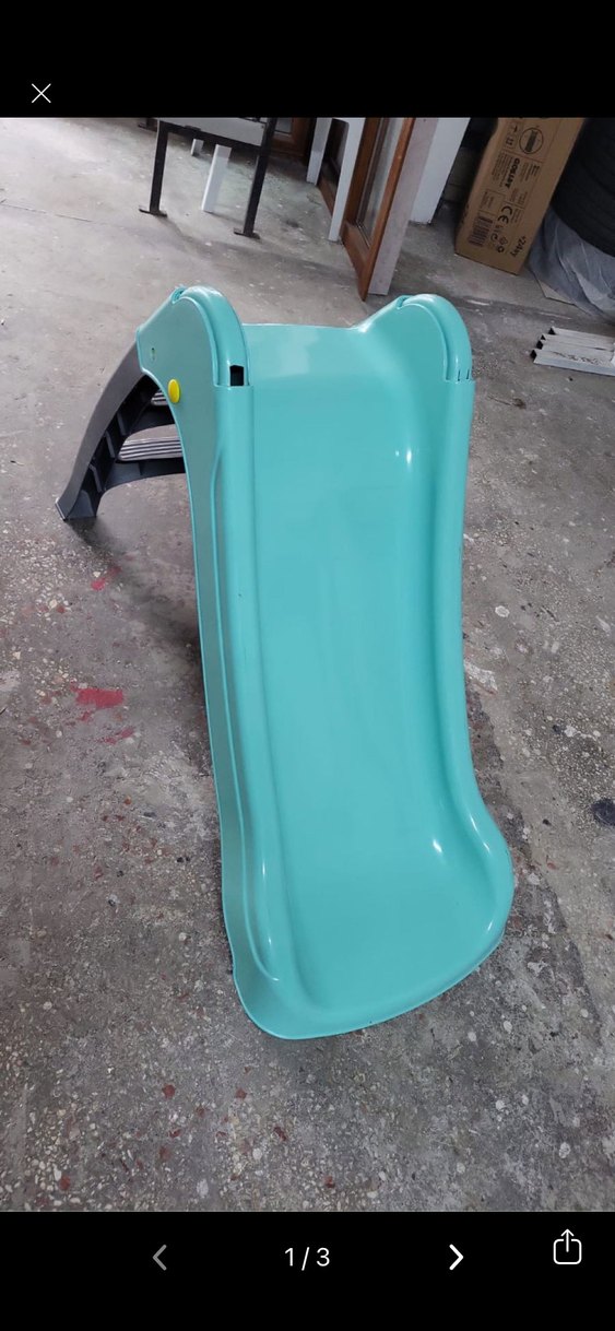 Turkuaz kaydırak yüzeyi ve gri basamaklarıyla çocuklar için güvenli ve eğlenceli bir oyun kaydırağıdır.
