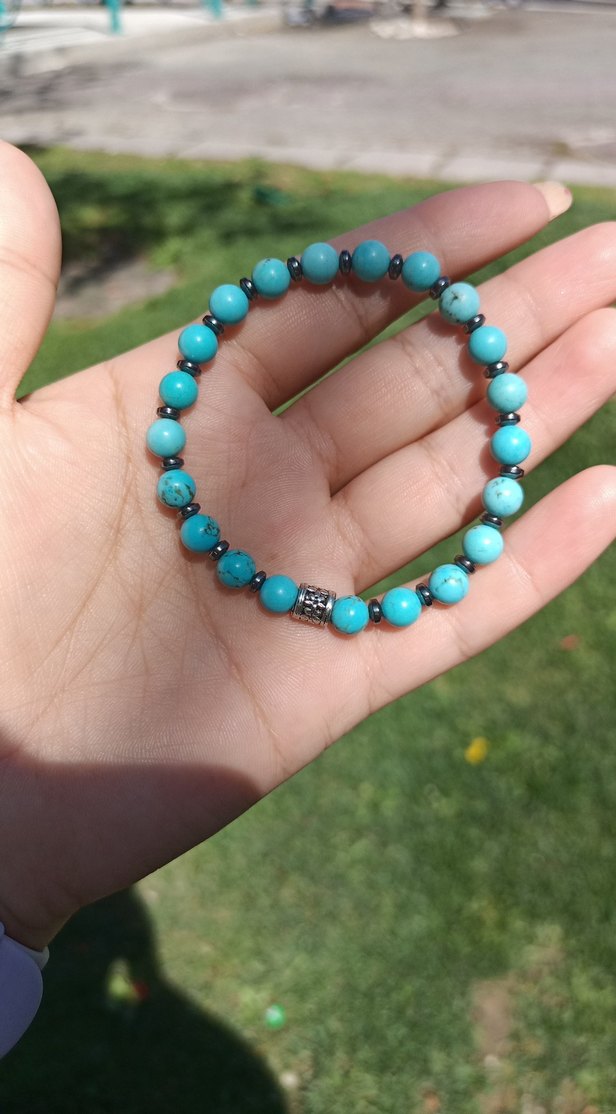 Minimalist ve renkli bohem tarzında, turkuaz ve hematit boncuklu kadın bileklik. Günlük kullanım için uygun, retro ve hippie havası taşıyor.