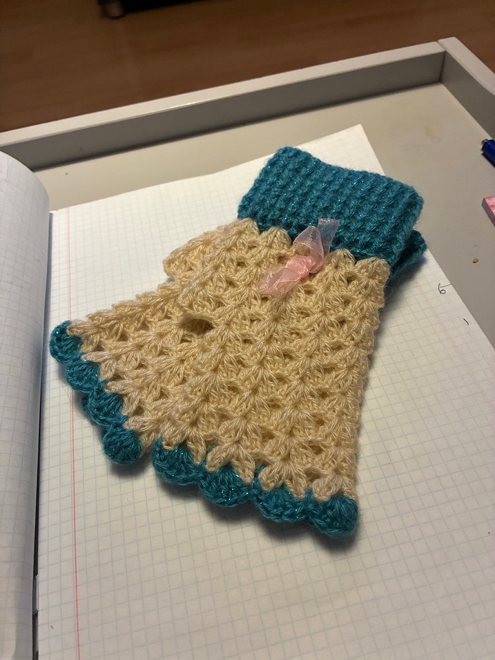 Örgü, rahat bohem tarzda kadın eldivenleri. Pastel turkuaz ve krem renkli, ince kurdele detayıyla süslenmiştir.