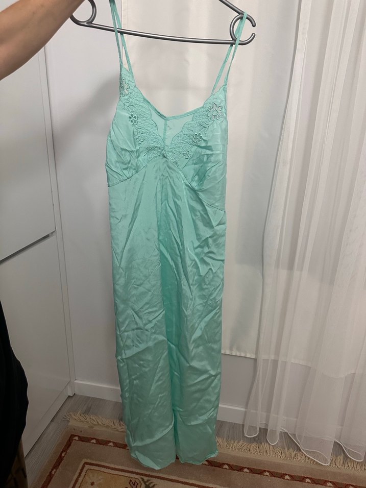 Turkuaz renkli, vintage tarzı, dantel detaylı, bohem görünümlü, uzun ve kolsuz kadın geceliği. 2 beden s-m uyumludur.