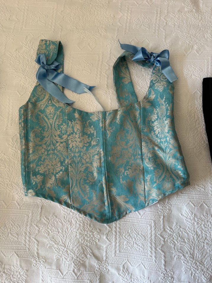 Turkuaz renkli, dantel detaylı ve straplez tasarımlı, parlak dokulu ve kurdele bağlamalı vintage tarzda fitted bustiyer.