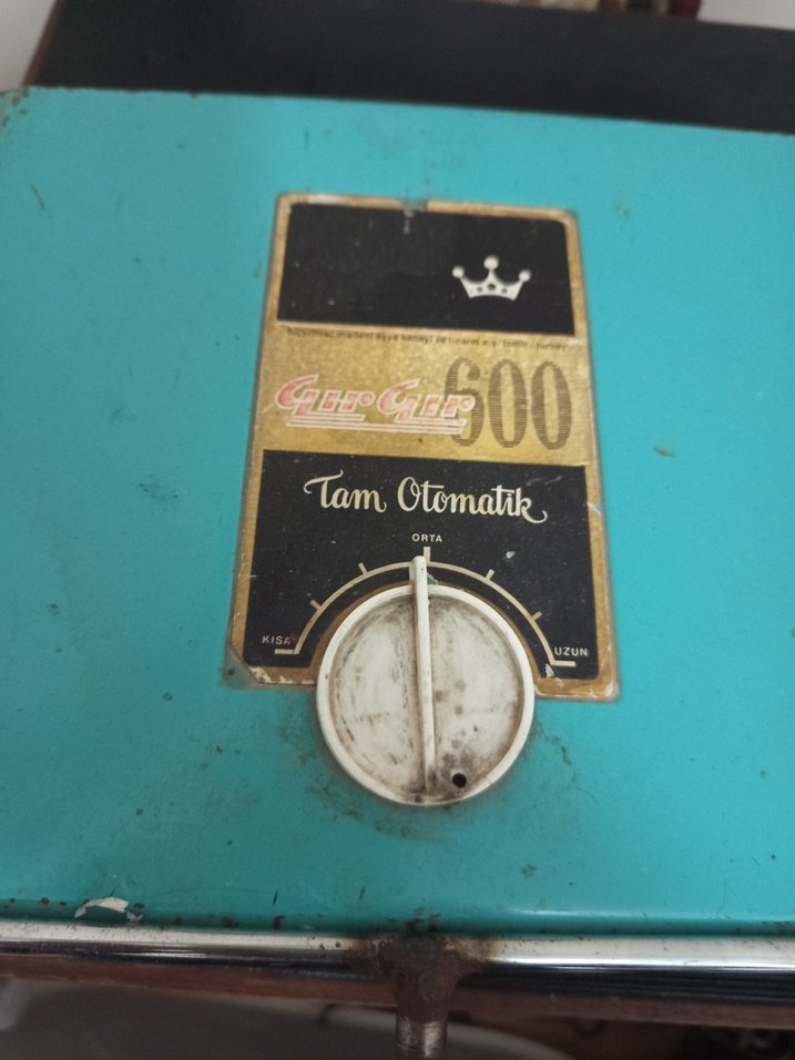 Parlak turkuaz renkte, eski tarz tam otomatik yazılı vintage rozet. Kısa-uzun ayarlı döner düğme bulunur. ️