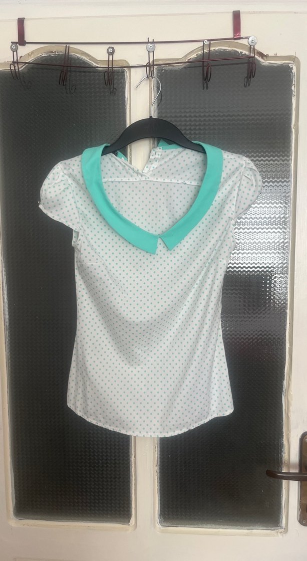 Turkuaz yaka detaylı, kısa kollu, düğmeli ve baskılı desenli, normal boyda, dar kesim hamile bluzu. Günlük kullanıma uygundur.