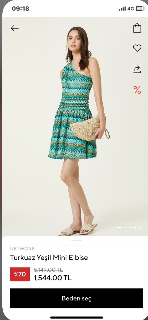 Turkuaz ve yeşil tonlarında batik desenli, straplez yaka ve pile detaylı, triko kumaştan mini ve vücuda oturan elbise. Günlük kullanıma uygun.
