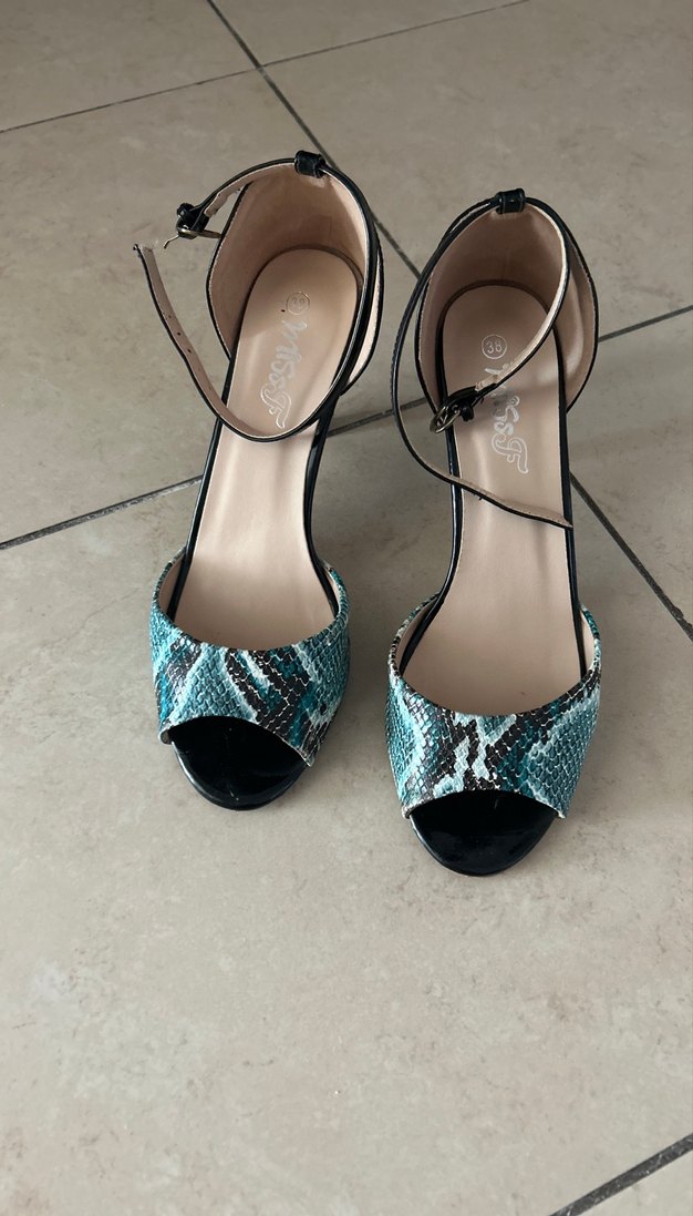 Turkuaz yılan derisi desenli, tokalı bilek bantlı, dayanıklı kauçuk malzemeden yapılmış topuklu ayakkabı.