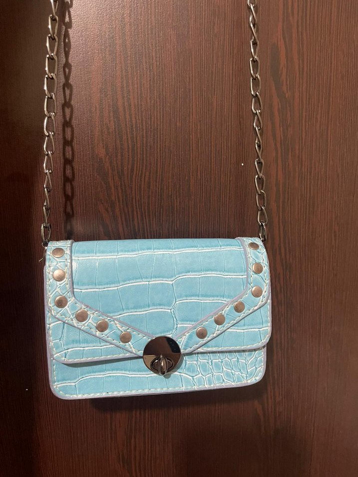 Turkuaz renkli, yılan derisi desenli çanta, zincir askılıdır ve bohem-retro tarzlarını yansıtır. Günlük kullanıma uygundur.