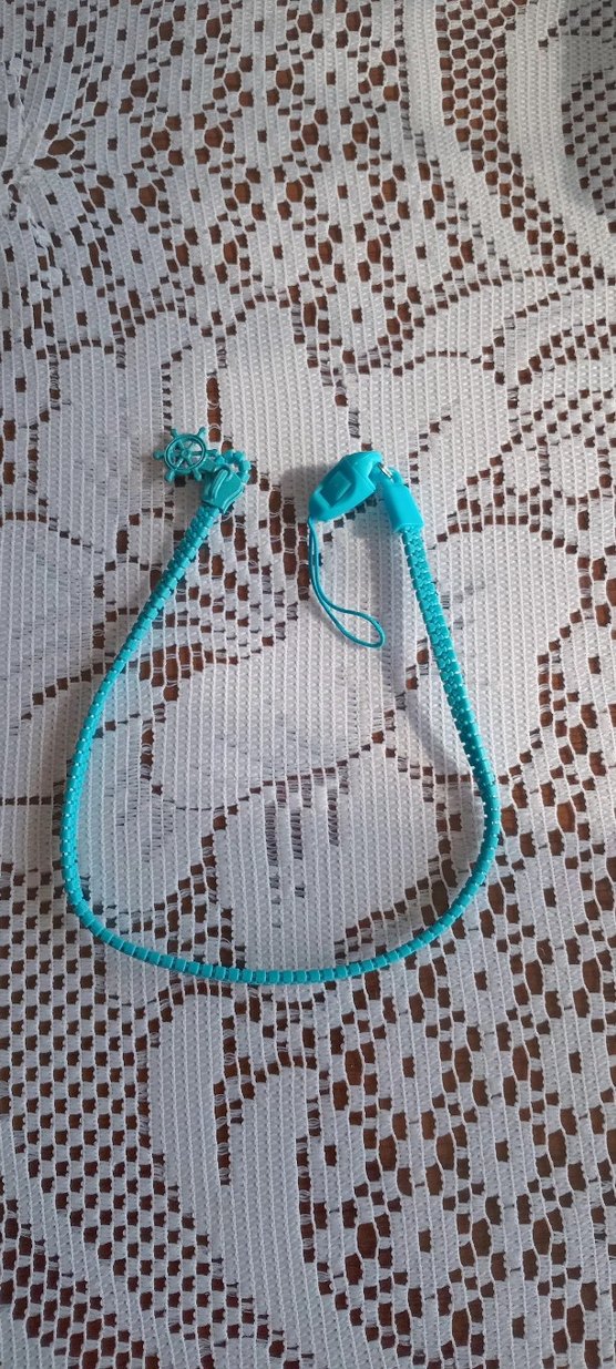 Turkuaz renkli, yılan desenli ve fermuarlı plastikten yapılmış renkli telefon aksesuarı.