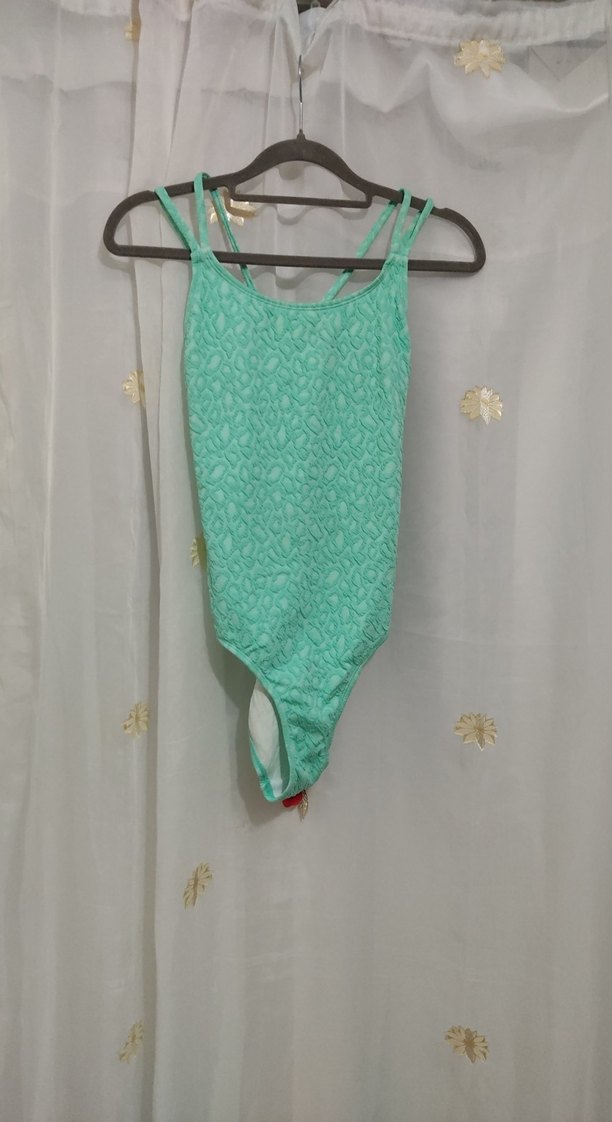 İpli askılı, turkuaz yılan deseni ve dantel detaylı, normal boyda, bohem tarzda kadın mayo. Plaj için uygun, vücuda oturan kesim.