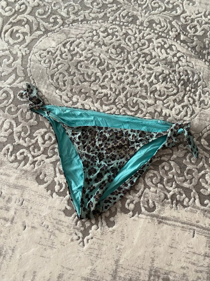 Turkuaz yılan desenli, yanları bağcıklı ve kürk detaylı bikini altı, plaj için uygun ve vücuda oturan kesimde.xl beden.
