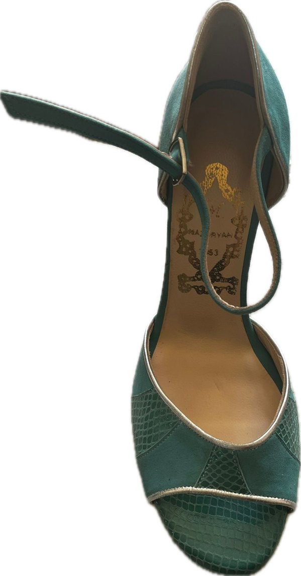 Turkuaz renkli, parlak yılan deseniyle süslü stiletto topuklu, bağcıklı ve kauçuk tabanlı klasik ve çağdaş şıklık sunar.%100 el yapımı bu özel ürün için ayakkabı numaranızı verdiğiniz takdirde size kargolama yapabiliriz