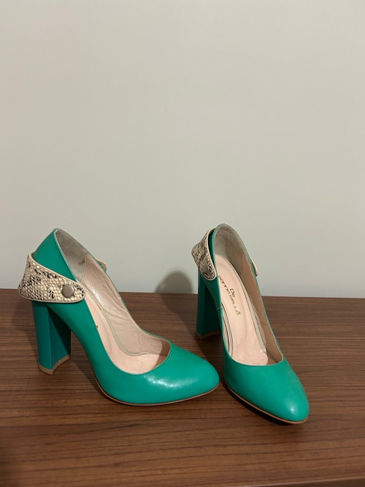 Turkuaz renkli, yılan desenli detaylara ve bağcıklı tasarıma sahip blok topuklu stilettolar, ofis için modern klasik tarzda. Bir kez kullanıldı Markasızdır, marka temsilidir 37 numara tam kalıptır Topuk boyu 10 cm Topuktaki minik leke nedenli fiyatı uygun tutulmuştur Kutusuz yumuşak sargı ile gönderim yapılacaktır.