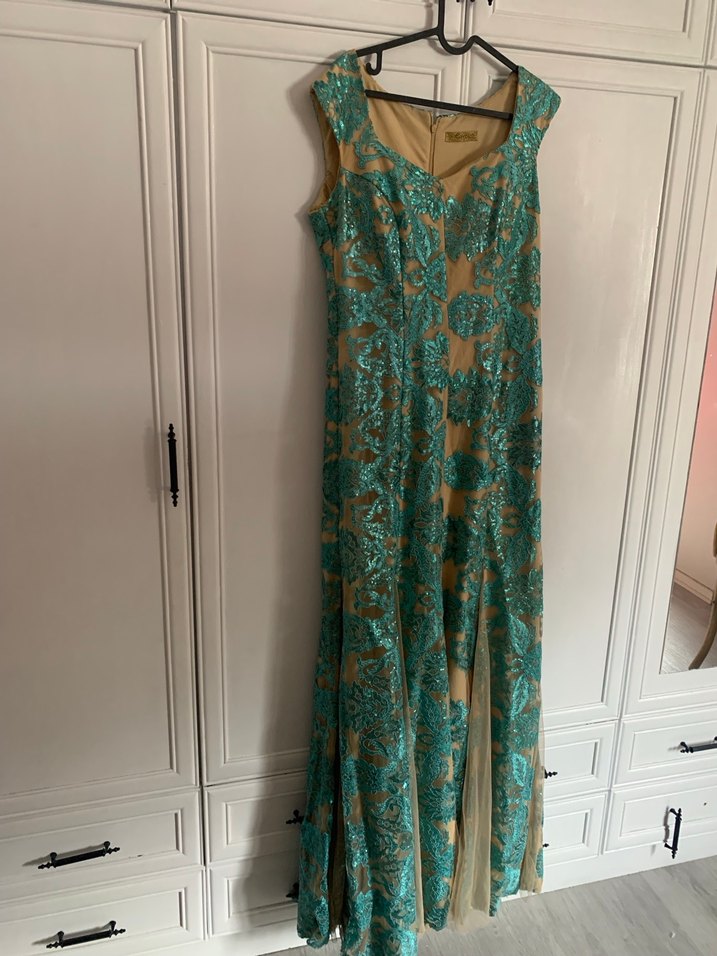 Turkuaz parlak yılan desenli, V yakalı, kolsuz, sentetik kumaştan, dökümlü ve bol kesimli uzun bohem elbise.