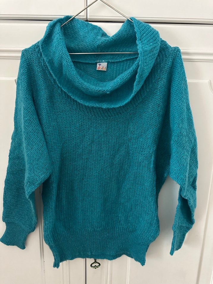 Turkuaz renkli, yüksek yakalı, uzun kollu, bol kesim örgü kadın kazak, günlük kullanıma uygun sade ve rahat bir stildir.